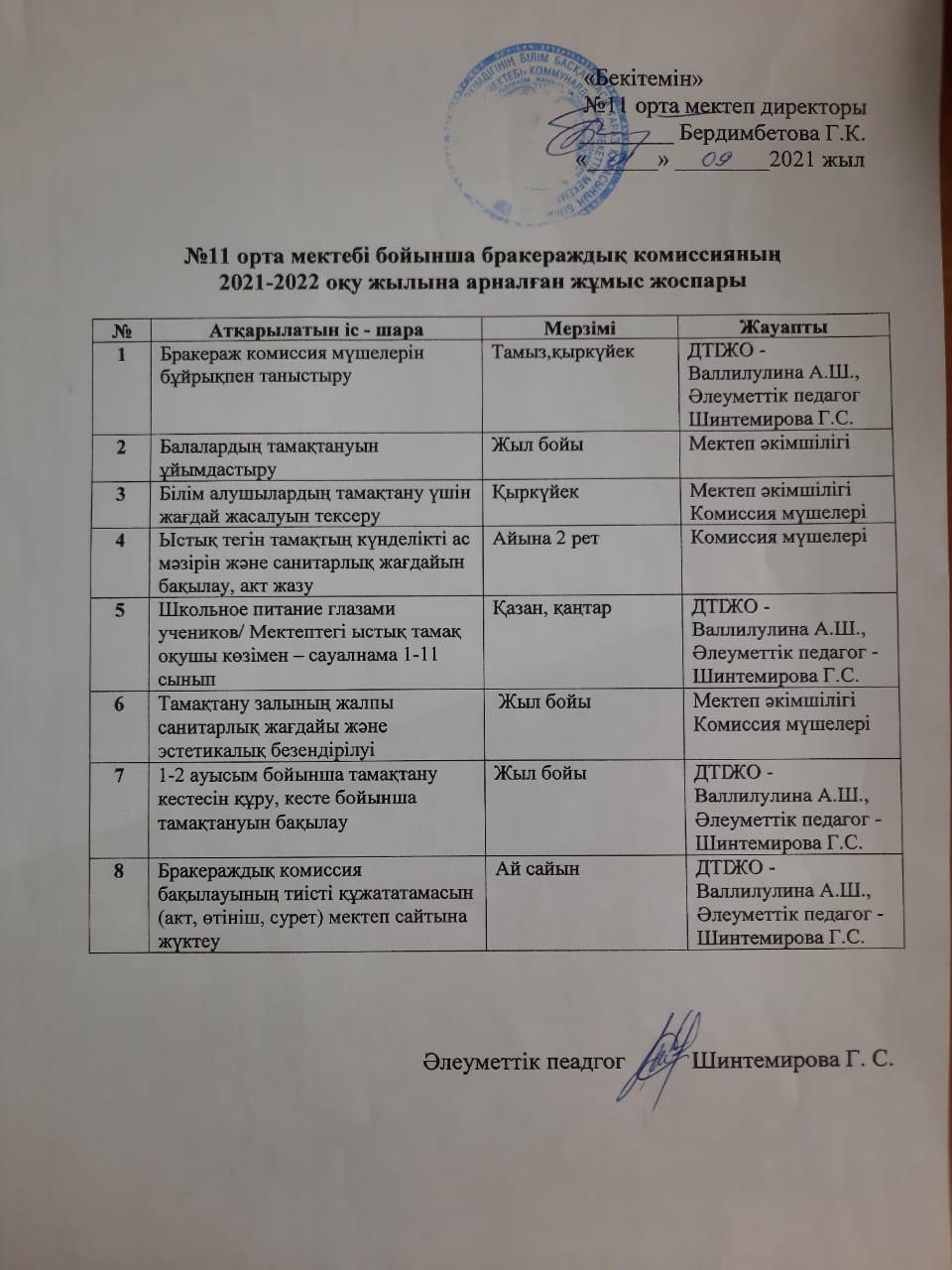 12 қараша 2021 0 1 2 3 4 5 №11 орта мектебі бойынша бракераждық комиссияның 2021-2022 оқу жылына арналған жұмыс жоспары