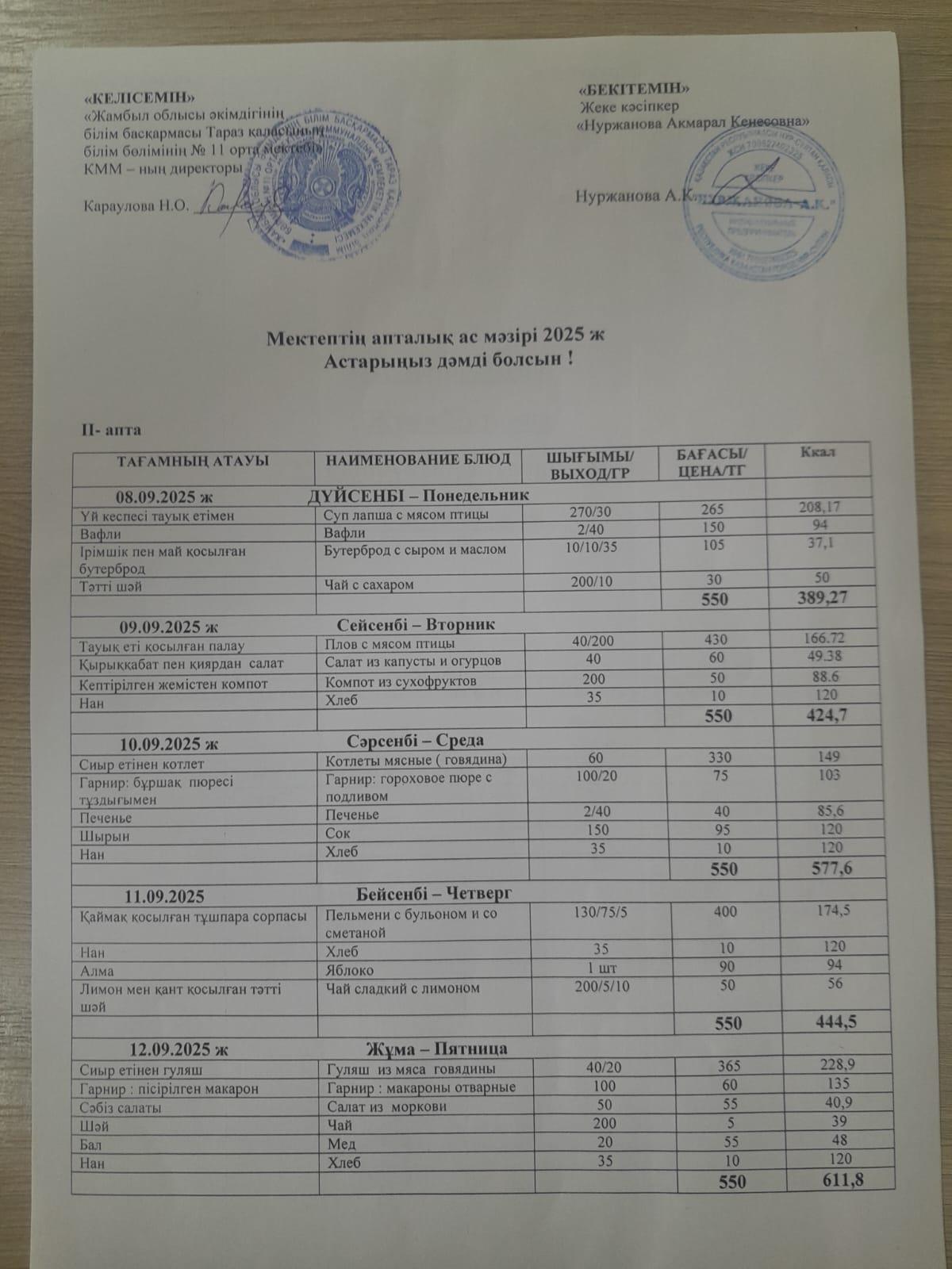 15 қыркүйек 2025 Меню