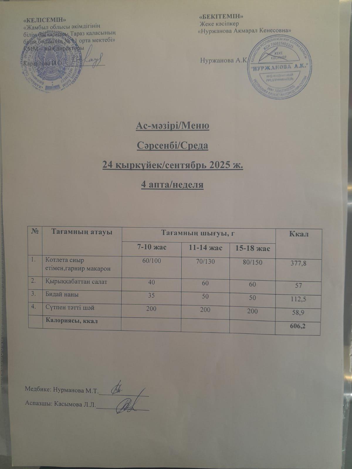 06 қыркүйек 2024 Ежедневное меню