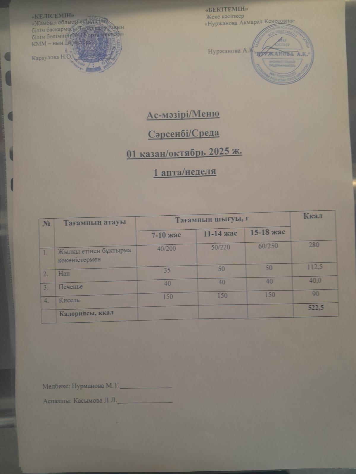 03 қыркүйек 2025 Ежедневное меню