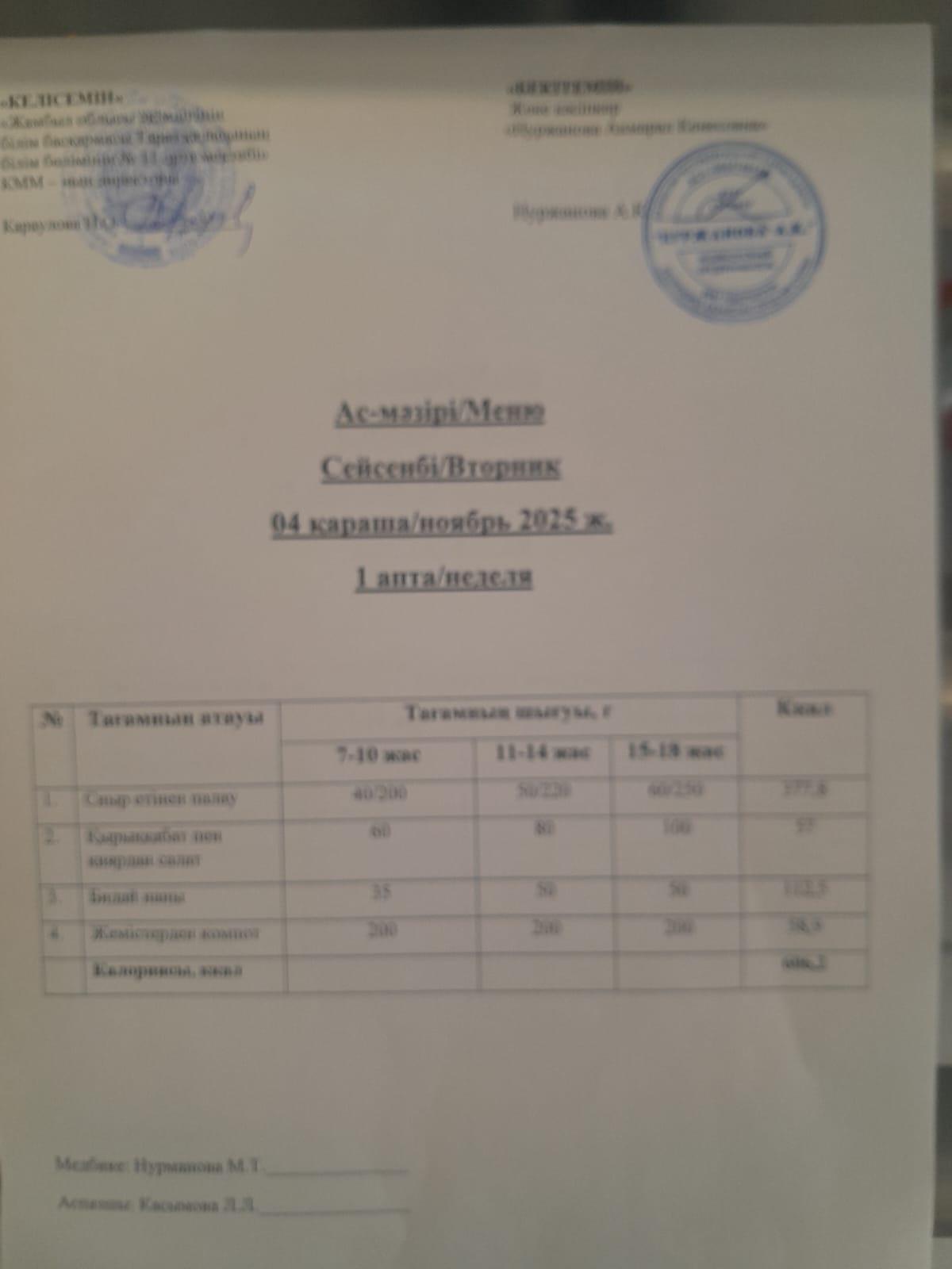 06 қараша 2024 Ежедневное меню