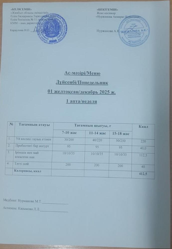 18 желтоқсан 2024 Ежедневное меню